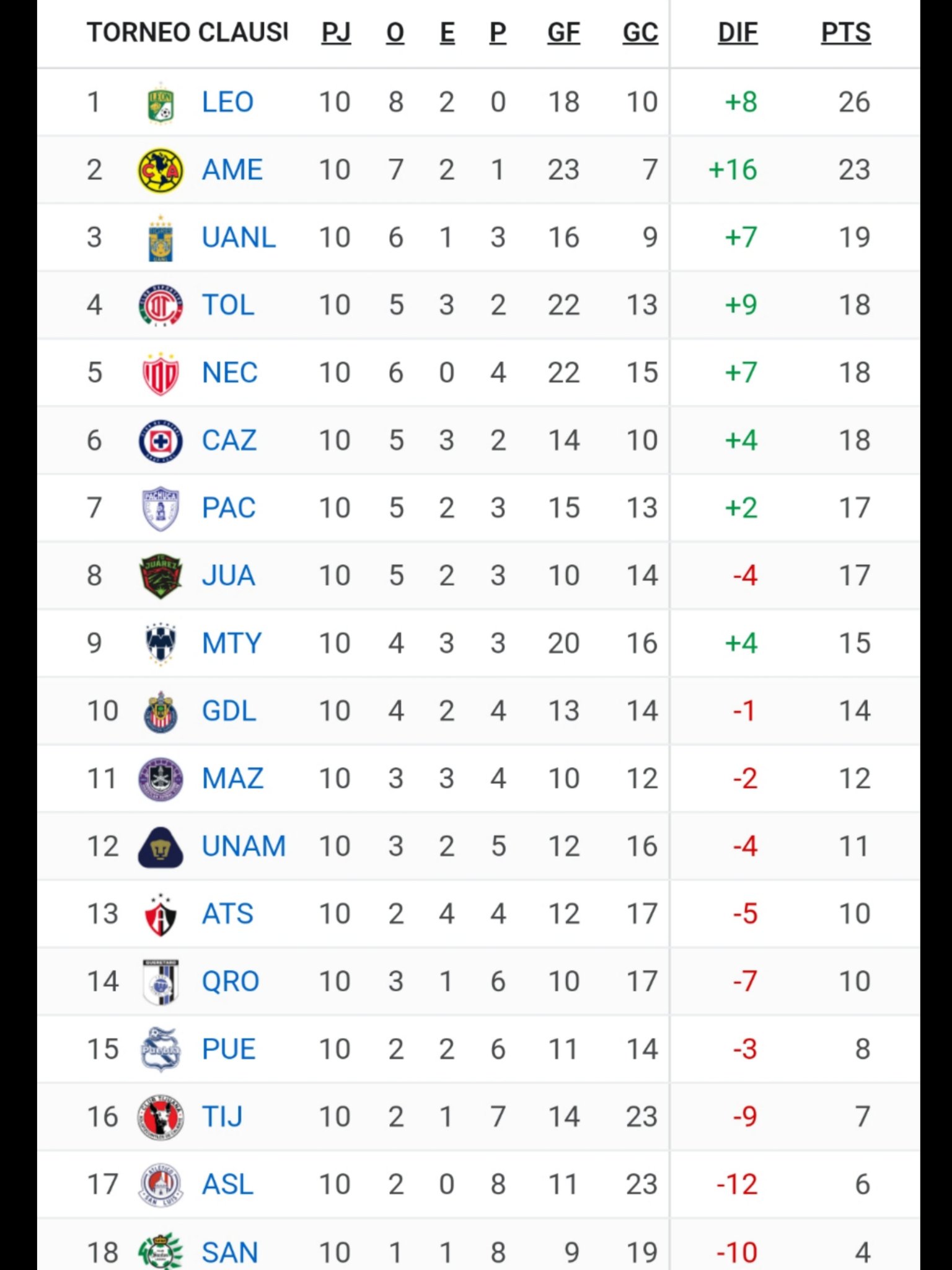 Al cierre de la fecha 10, León es líder invicto con 26 puntos, con 23 le sigue América y 19 de Tigres.