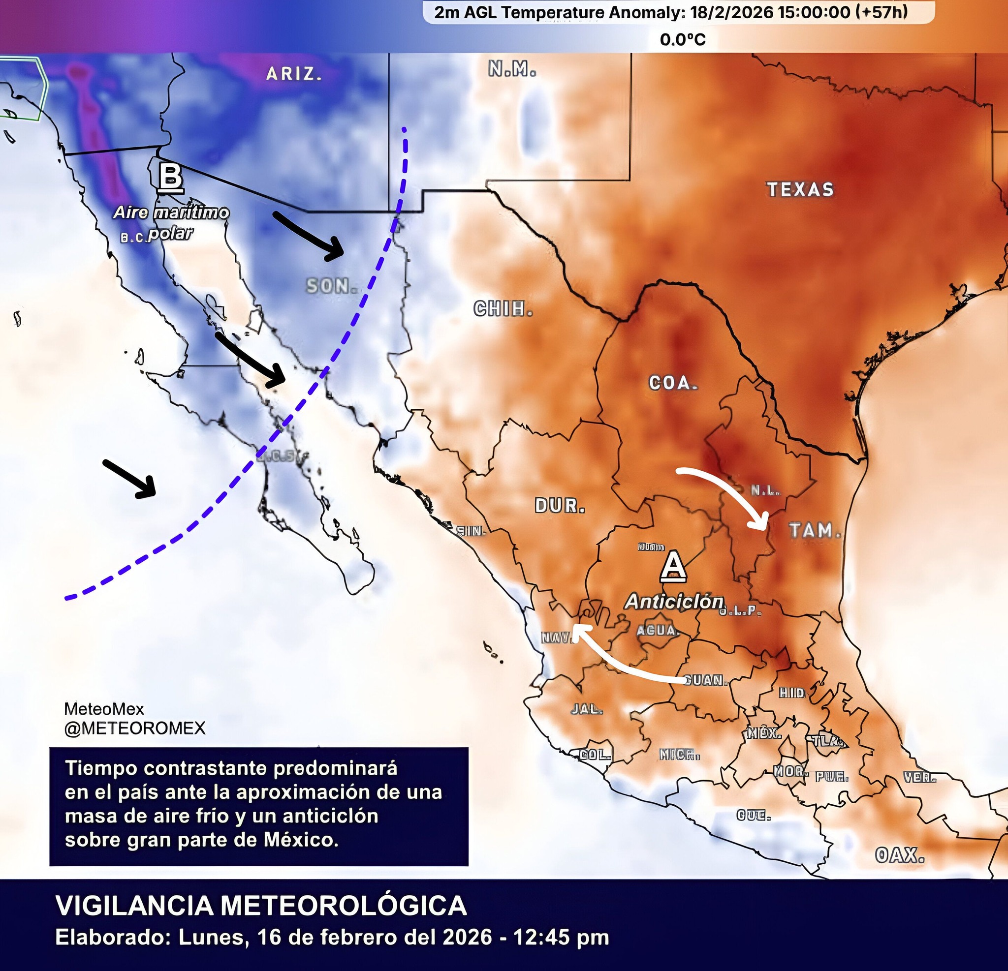 “El análisis (de Meteomex) determina que la masa de aire frío intentará avanzar hacia el resto del territorio nacional, pero será frenada por una extensa circulación anticiclónica. Este sistema actuará como bloqueo atmosférico, limitando el desplazamiento del aire polar y confinándolo en el noroeste”, indica la información de la organización climática.