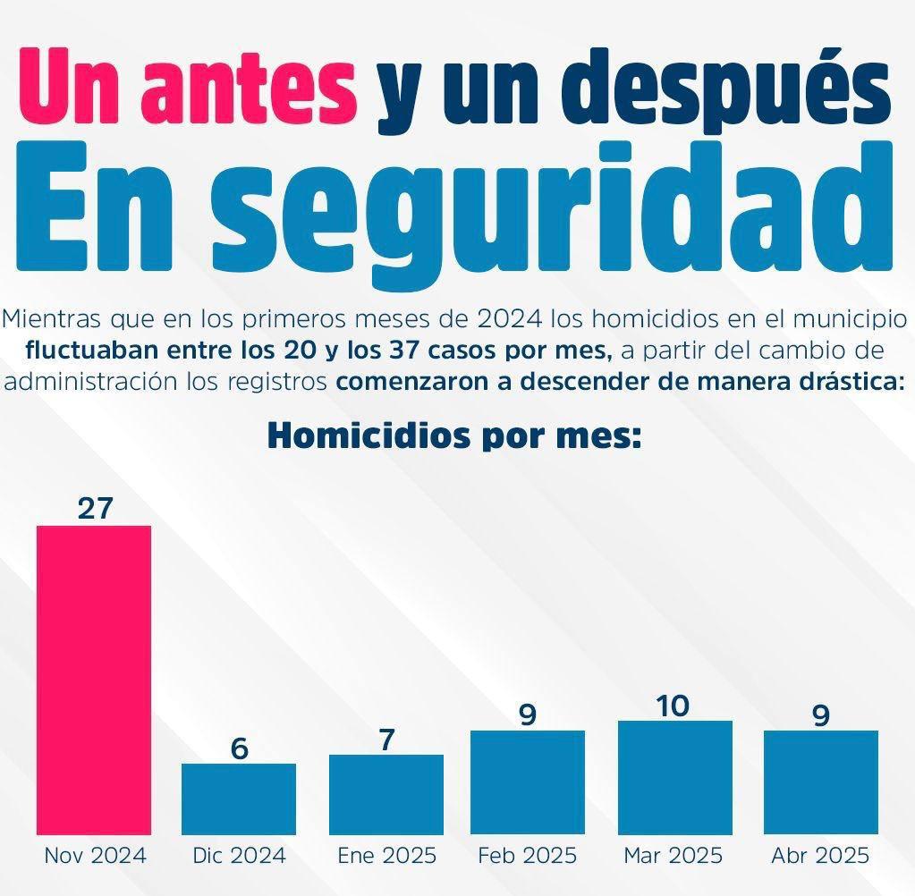 En los primeros meses de 2024, el municipio registraba homicidios mensuales que fluctuaban entre 20 y 37 casos. A partir del cambio de administración, los registros comenzaron a descender de manera drástica:
