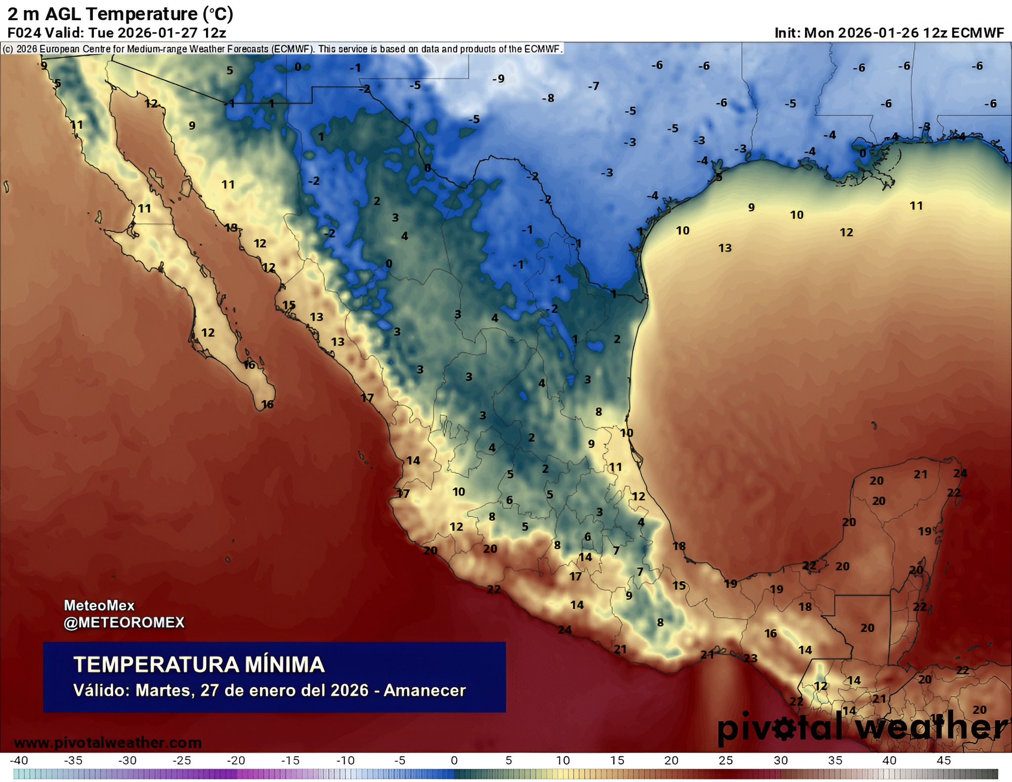 El análisis indica que se registrarán temperaturas heladas, con valores entre 1 y -5°C, principalmente en los siguientes estados: Sonora (norte), Chihuahua, Coahuila, Nuevo León y Tamaulipas