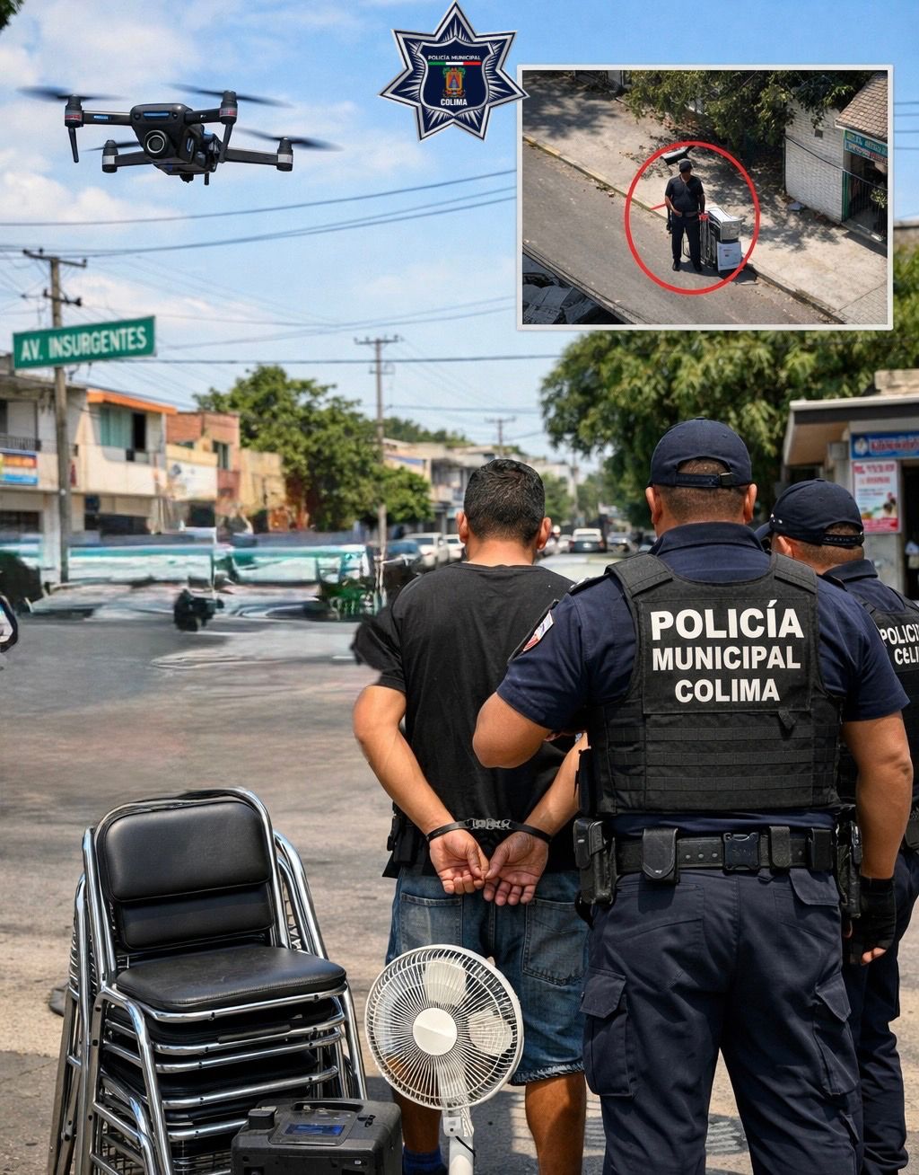 La Dirección General de Seguridad Pública invita a la ciudadanía que haya sido víctima de robo recientemente y que pueda reconocer las sillas metálicas u otros objetos recuperados, a acudir a sus instalaciones para la identificación correspondiente y presentar la denuncia formal, a fin de fortalecer las investigaciones. La Policía Municipal de Colima reitera su compromiso de mantener la seguridad y el orden en el municipio, apoyándose en herramientas tecnológicas como el sistema de videovigilancia aérea, y exhorta a la población a reportar cualquier hecho sospechoso a través de los números de emergencia.