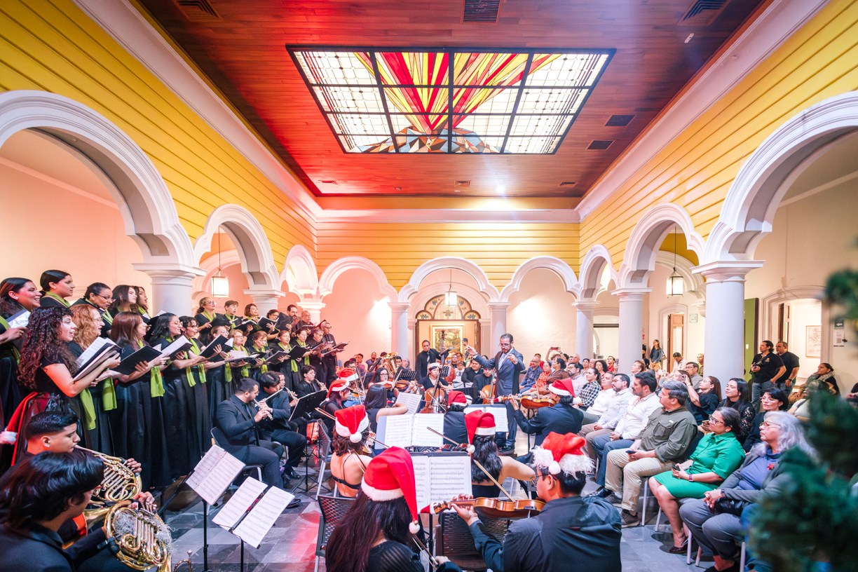 Para cerrar las actividades artísticas universitarias de 2025, se llevó a cabo la noche del jueves 18 en la Pinacoteca Universitaria el concierto “A Christmas Festival”, en que la Orquesta Sinfónica y el Coro de la Universidad de Colima, bajo la dirección del maestro José Antonio Frausto Zamora, ofrecieron un programa con temas de compositores como Wolfgang Amadeus Mozart, George Frederic Haendel, John Williams y Agustín Lara, en un acto que contó con la presencia del rector de la casa de estudios, Christian Torres Ortiz Zermeño.