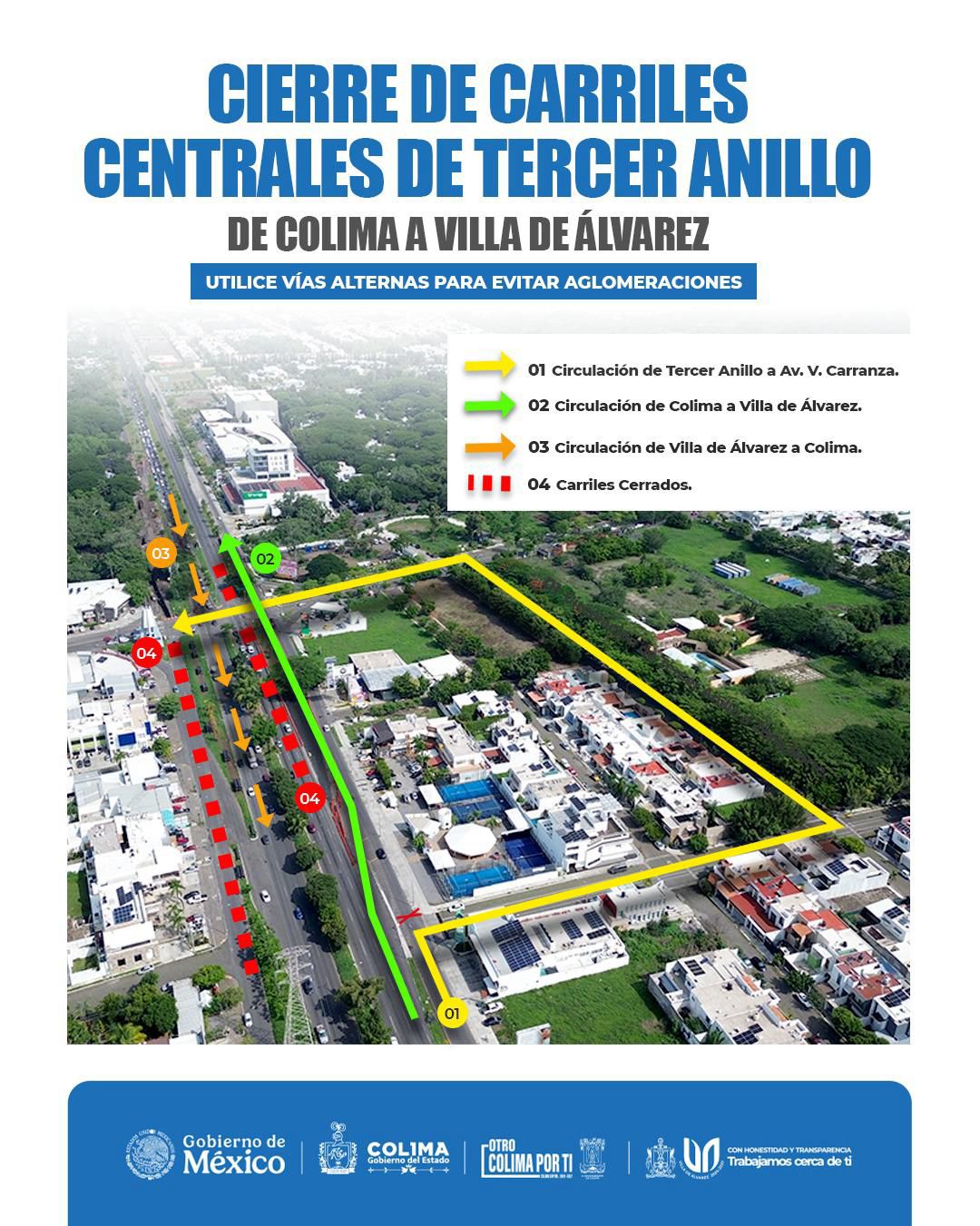 Las labores se llevarán a cabo con apego a los protocolos de seguridad y en coordinación con la Secretaría de Infraestructura, Comunicaciones y Transportes (SICT) del gobierno federal en Colima, así como con los ayuntamientos de Colima y Villa de Álvarez, a fin de garantizar el menor impacto posible a la población. La Seidum exhorta a los conductores que transitan por esta área a consultar los avisos del gobierno estatal, SICT y los Ayuntamientos de Colima y Villa de Álvarez, para anticipar sus traslados, respetar los límites de velocidad y señalamientos preventivos, así como las indicaciones del personal de apoyo, consultar mapas actualizados en redes sociales o aplicaciones y buscar rutas alternas para evitar congestionamientos.