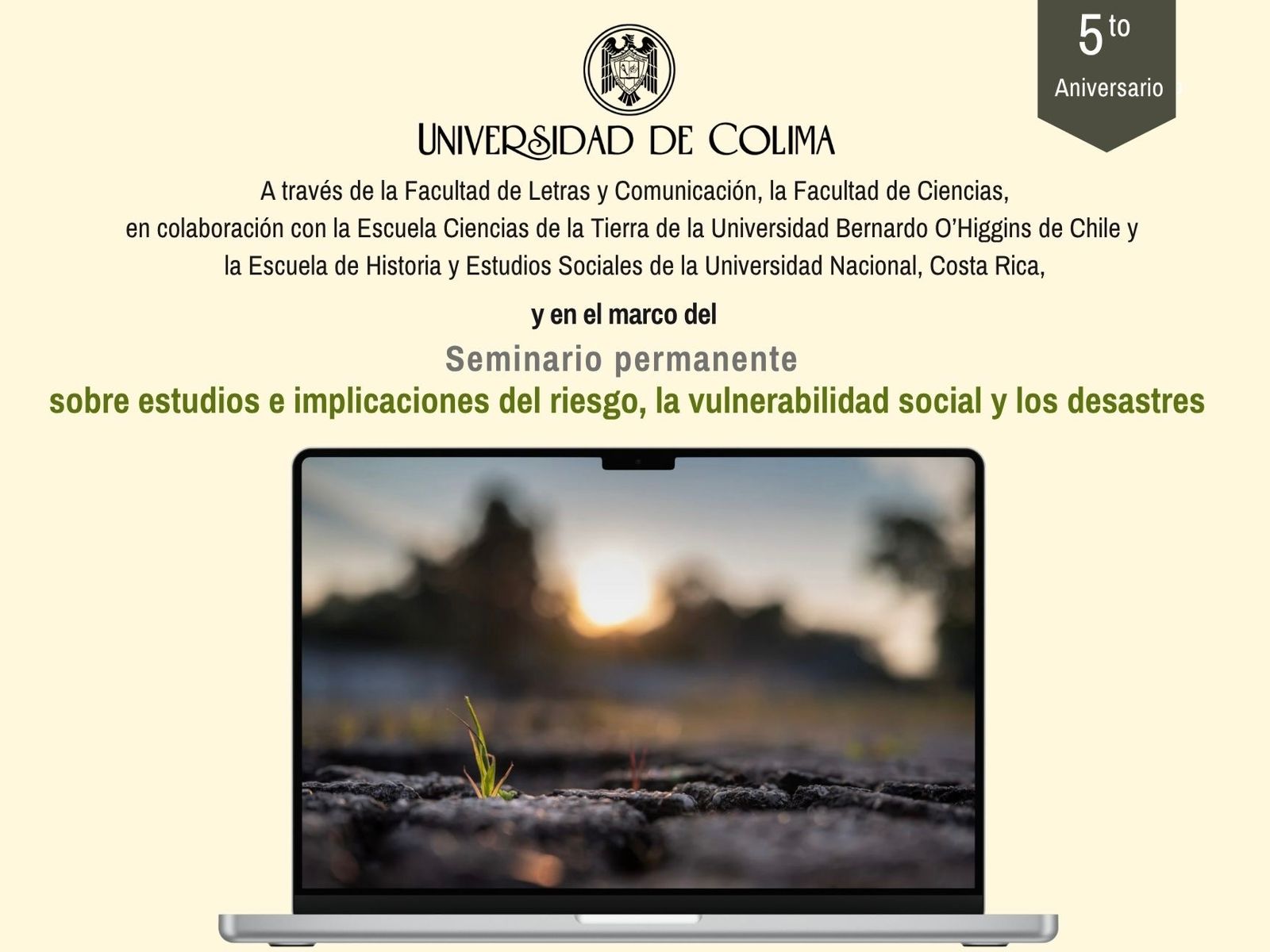 Con una sesión conmemorativa en línea, la Universidad de Colima celebró el quinto aniversario del Seminario Permanente de Estudios e Implicaciones del Riesgo, la Vulnerabilidad Social y los Desastres, coordinado por las doctoras Alicia Cuevas Muñiz y Aideé C. Arellano Ceballos, quienes destacaron el valor de este espacio como un referente académico que promueve la reflexión crítica y multidisciplinaria sobre los desastres desde una perspectiva social y humana.