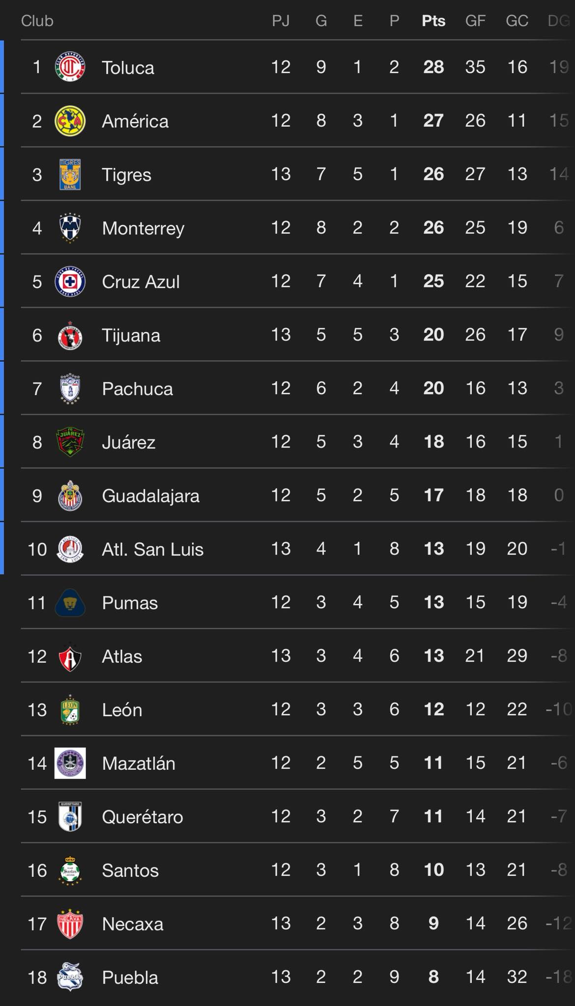 Con esa victoria, Cruz Azul se ubicó segundo de la tabla, a 3 puntos del líder Toluca y 1 por encima de América y Monterrey.