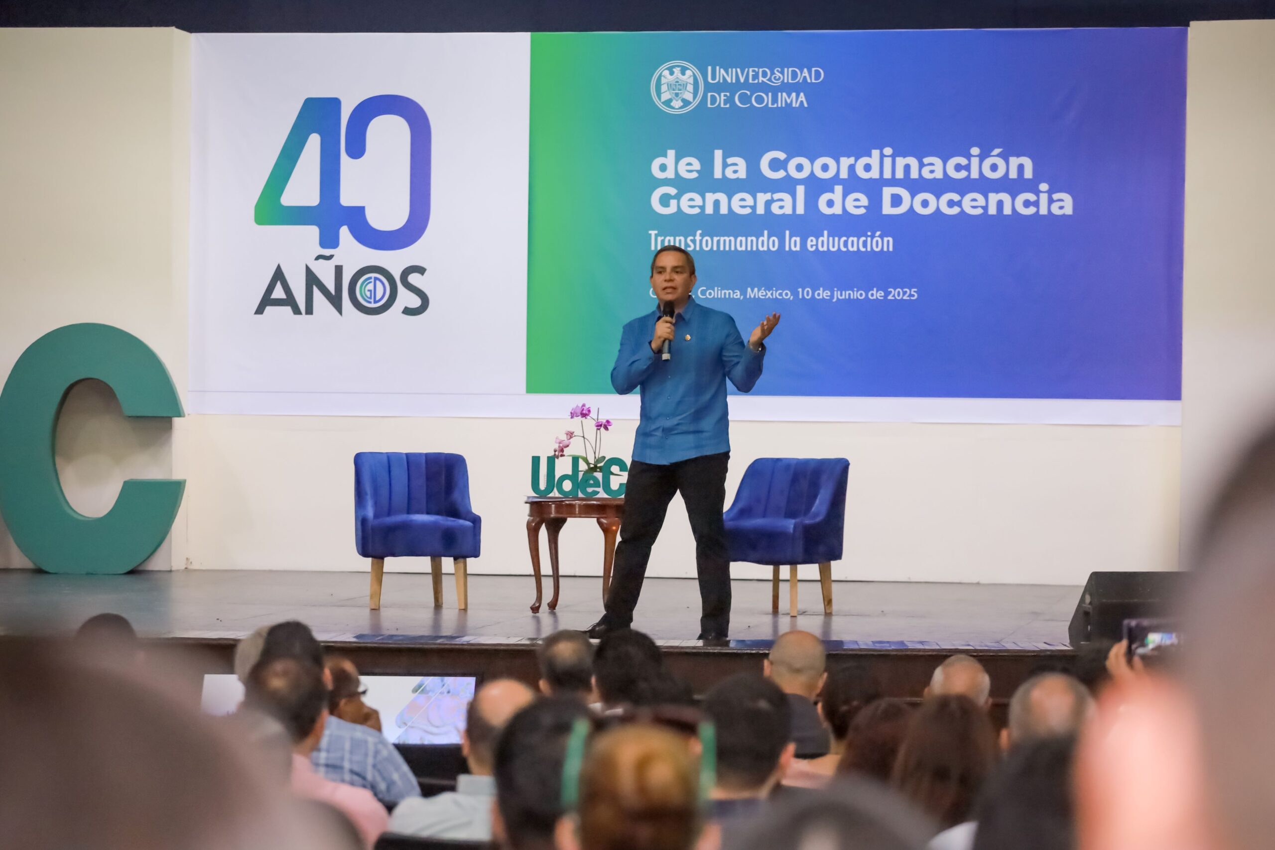 Previamente a su conferencia, el rector felicitó a todos quienes han contribuido al crecimiento y fortalecimiento de la Coordinación General de Docencia a lo largo de esos 40 años. “Una coordinación clave y emblemática en el desarrollo de la historia de la Universidad de Colima”. En la conferencia habló de dos momentos, el desarrollo, logros y desafíos, y la evolución de la docencia en la Universidad de Colima.