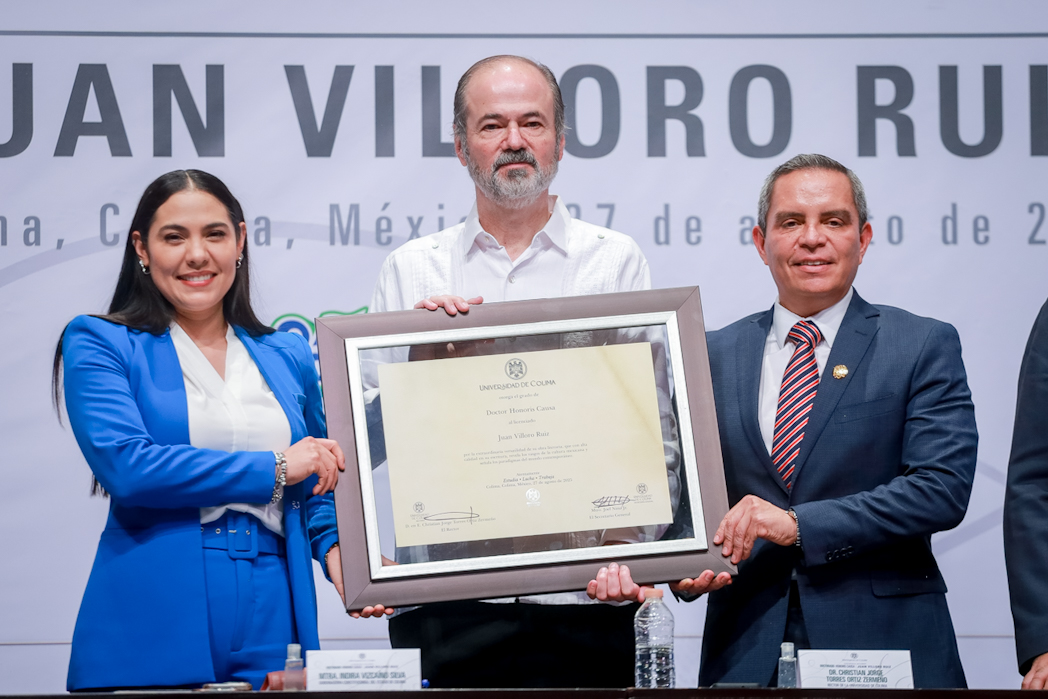 Christian Jorge Torres Ortiz Zermeño, rector de la Universidad de Colima, entregó en nombre de la comunidad universitaria, el grado de Doctor Honoris Causa a Juan Villoro Ruiz, destacado escritor, cronista, ensayista y periodista mexicano por la extraordinaria versatilidad de su obra literaria, que, dice el Acuerdo, “con alta calidad en su escritura, revela los rasgos de la cultura mexicana y señala los paradigmas del mundo contemporáneo”.