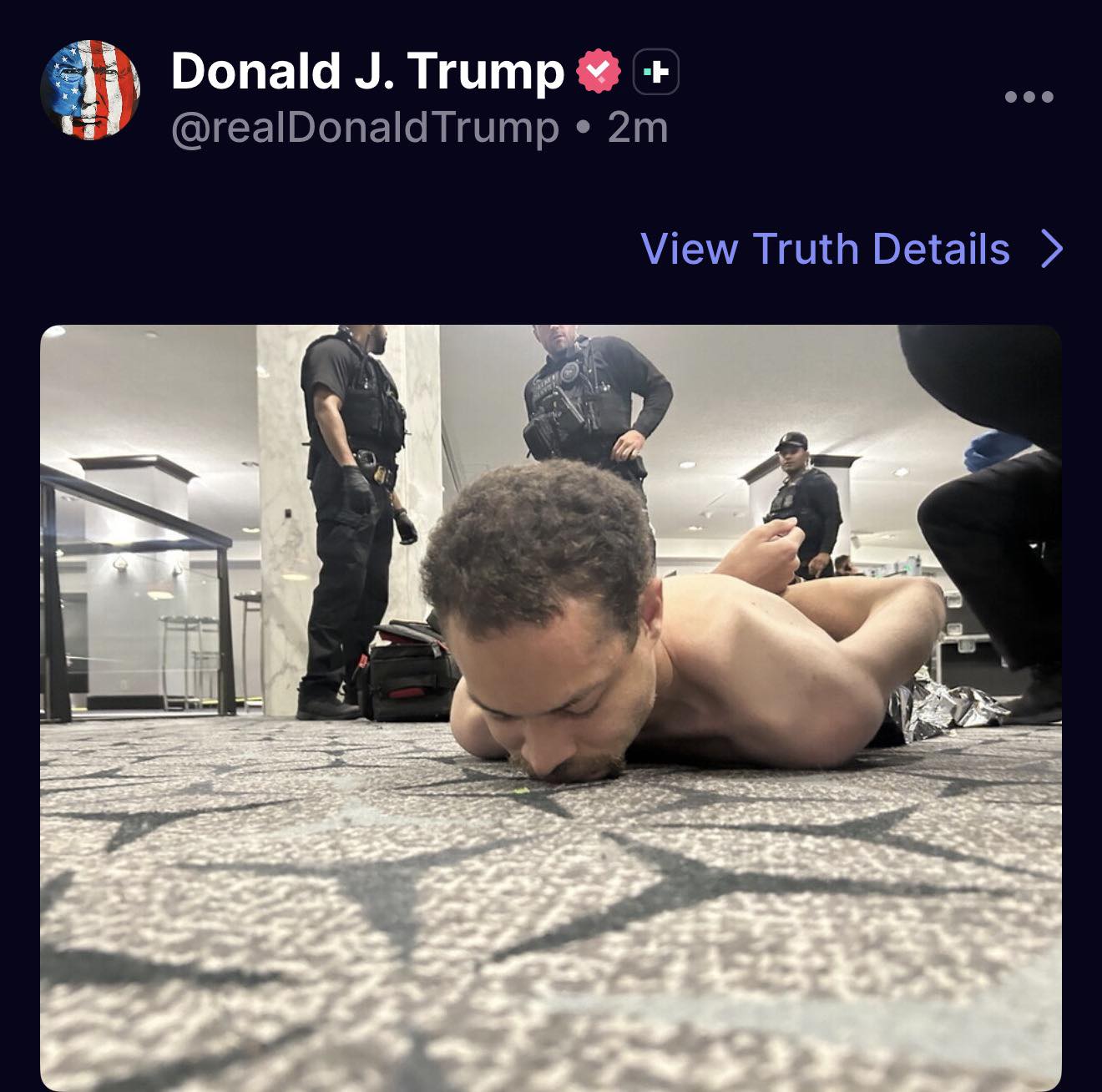 (Foto: El presunto autor del atentado contra Trump se muestra sometido por el Servicio Secreto. La fotografía fue publicada anoche en redes por el propio presidente de Estados Unidos.)