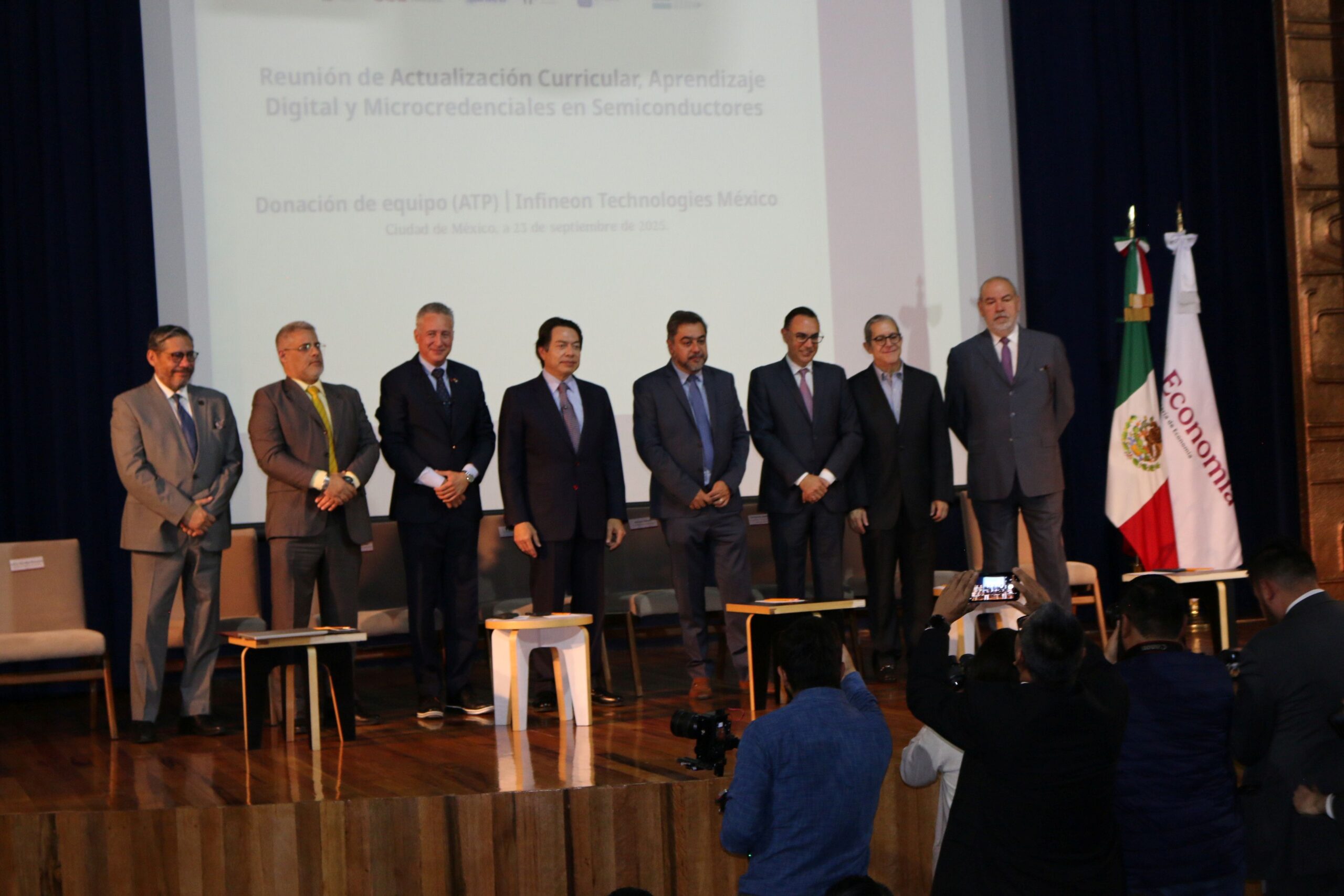 De igual forma, se desarrolló la Primera Reunión Anual para la Actualización Curricular, Aprendizaje Digital y Microcredenciales para alinear la educación técnica y universitaria con los sectores estratégicos y el Plan México, así como la donación, por parte de Infineon Technologies México, de cinco equipos ATP (Ensamblaje, Pruebas y Empaque) para el mismo número de universidades.
