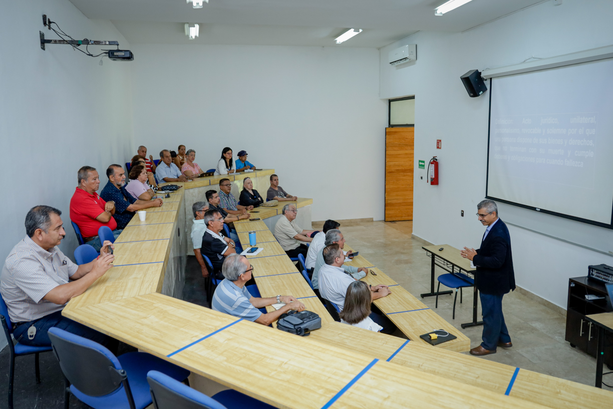 Para sensibilizar a sus agremiados sobre la importancia de prever el futuro patrimonial y evitar conflictos familiares, la Asociación de Jubilados y Pensionados de la Universidad de Colima organizó la conferencia El Testamento, impartida por Julio César Gómez Santos, docente de la Facultad de Derecho, en el Archivo Histórico y Hemeroteca de la casa de estudios.