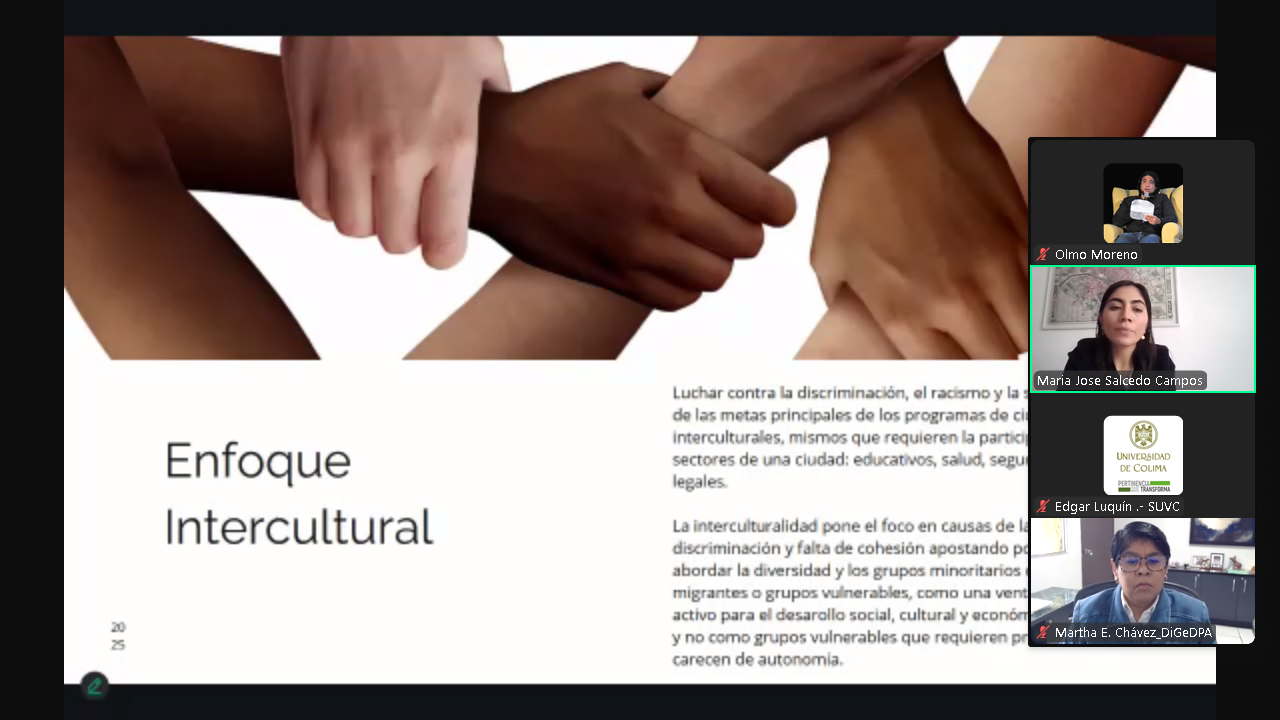 Salcedo Campos subrayó que esta perspectiva aborda la diversidad y la presencia de grupos minoritarios no como obstáculos, sino como ventajas comparativas para el desarrollo social, cultural y económico. “El enfoque intercultural trabaja sobre la falta de cohesión social, integrando activamente a personas migrantes, refugiadas, desplazadas, integrantes de la comunidad LGBT, mujeres, personas con discapacidad y comunidades indígenas”, puntualizó.