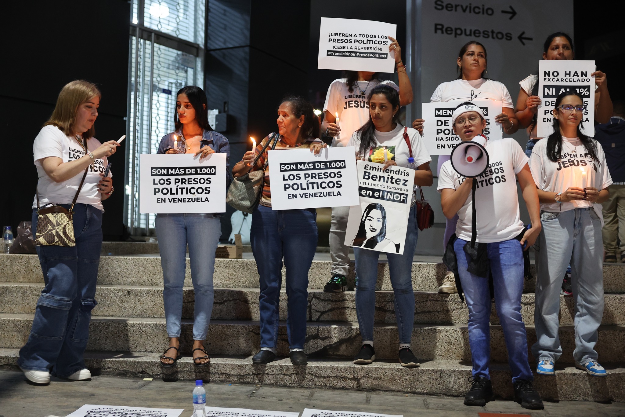 AME3379. CARACAS (VENEZUELA), 09/01/2026.- Familiares de presos políticos sostienen carteles durante una vigilia frente a El Helicoide este viernes, en Caracas (Venezuela). El Rodeo I, Tocorón, Ramo Verde, El Helicoide y Yare II son las cárceles con más presos políticos en Venezuela, y están entre las más mencionadas en los reportes sobre estos casos, pero son apenas cinco de los 120 centros donde permanecen personas que, según ONG, están encarceladas por motivos políticos. EFE/ Miguel Gutiérrez