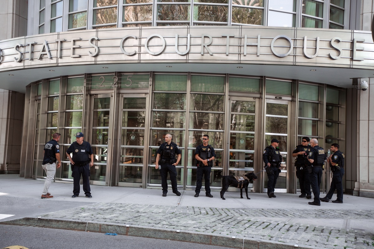 Oficiales del Departamento de Seguridad Nacional patrullan afuera de una audiencia de declaración de culpabilidad para el fundador del Cartel de Sinaloa, Ismael Zambada García, conocido como El Mayo, en el Tribunal del Distrito Este de Nueva York, en Brooklyn. EFE/Olga Fedorova