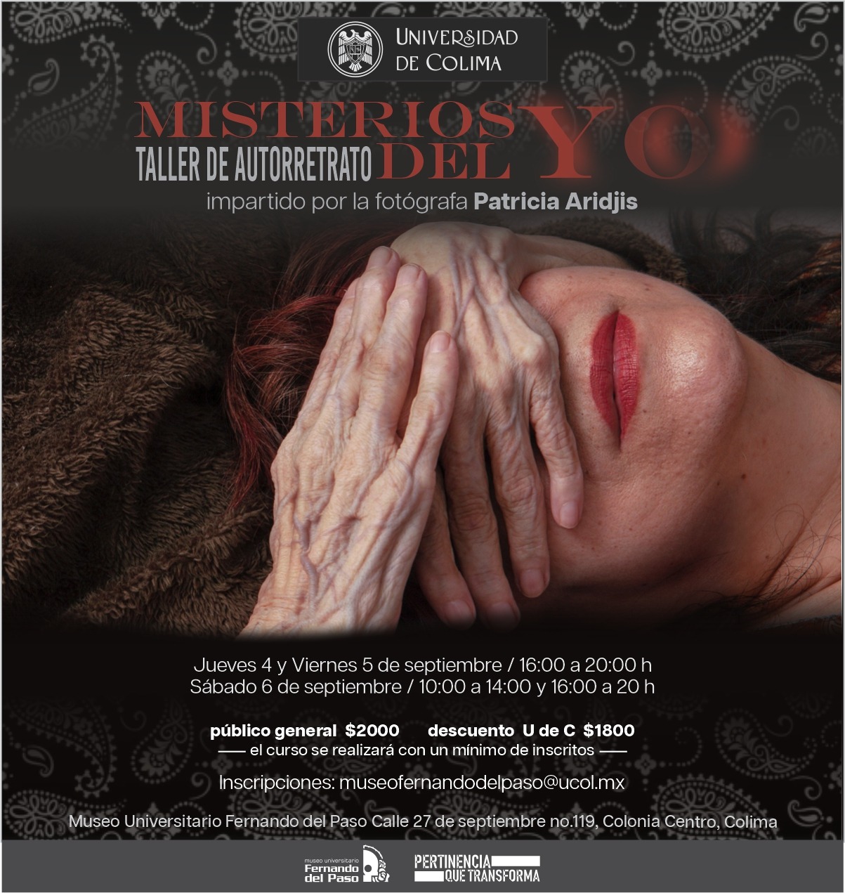 El Museo Universitario Fernando del Paso invita a participar en el taller de autorretrato “Misterios del yo”, que será impartido por la fotógrafa Patricia Aridjis como actividad de cierre de su exitosa exposición Mujeres de peso, la cual se exhibe en este espacio desde mayo pasado.
