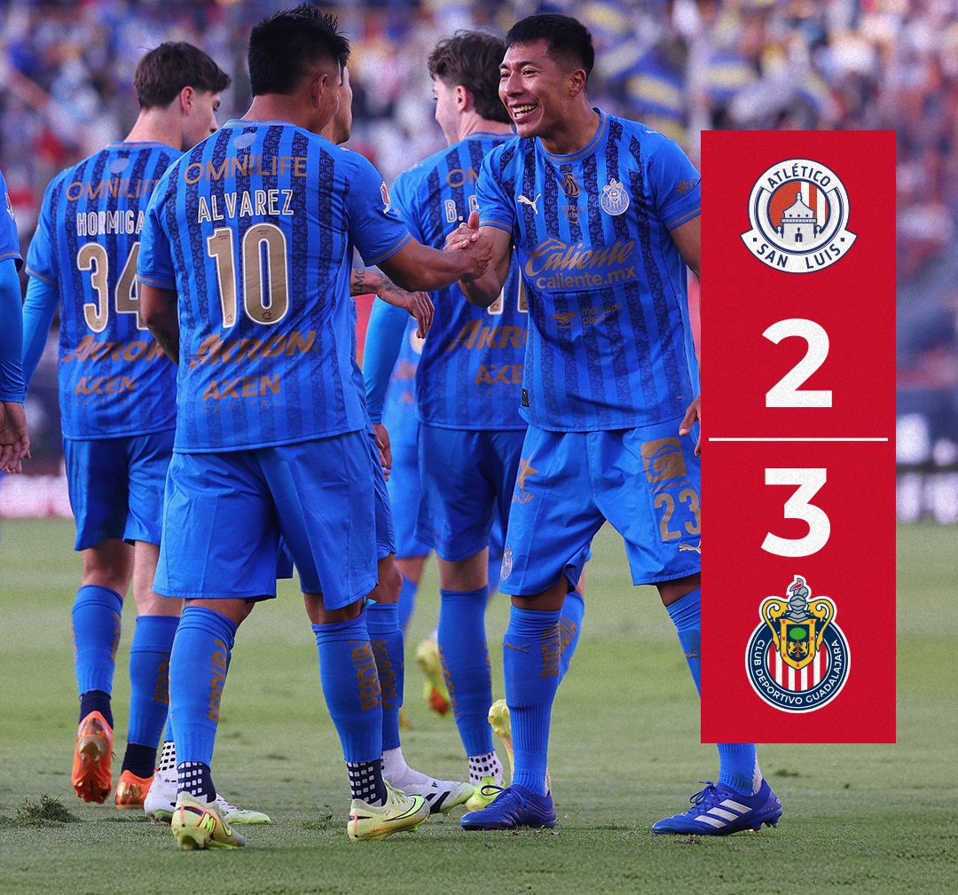 Chivas es líder de la liga luego de derrotar 3 a 2 a San Luis. Con 4 de 4, Guadalajara tiene 12 puntos y refrendó su posición. Ledezma, Aguirre y La Hormiga anotaron por las cabras. Y los sanluisinos lo hicieron mediante doblete del campeón de goleo del torneo anterior, Joao Pedro.