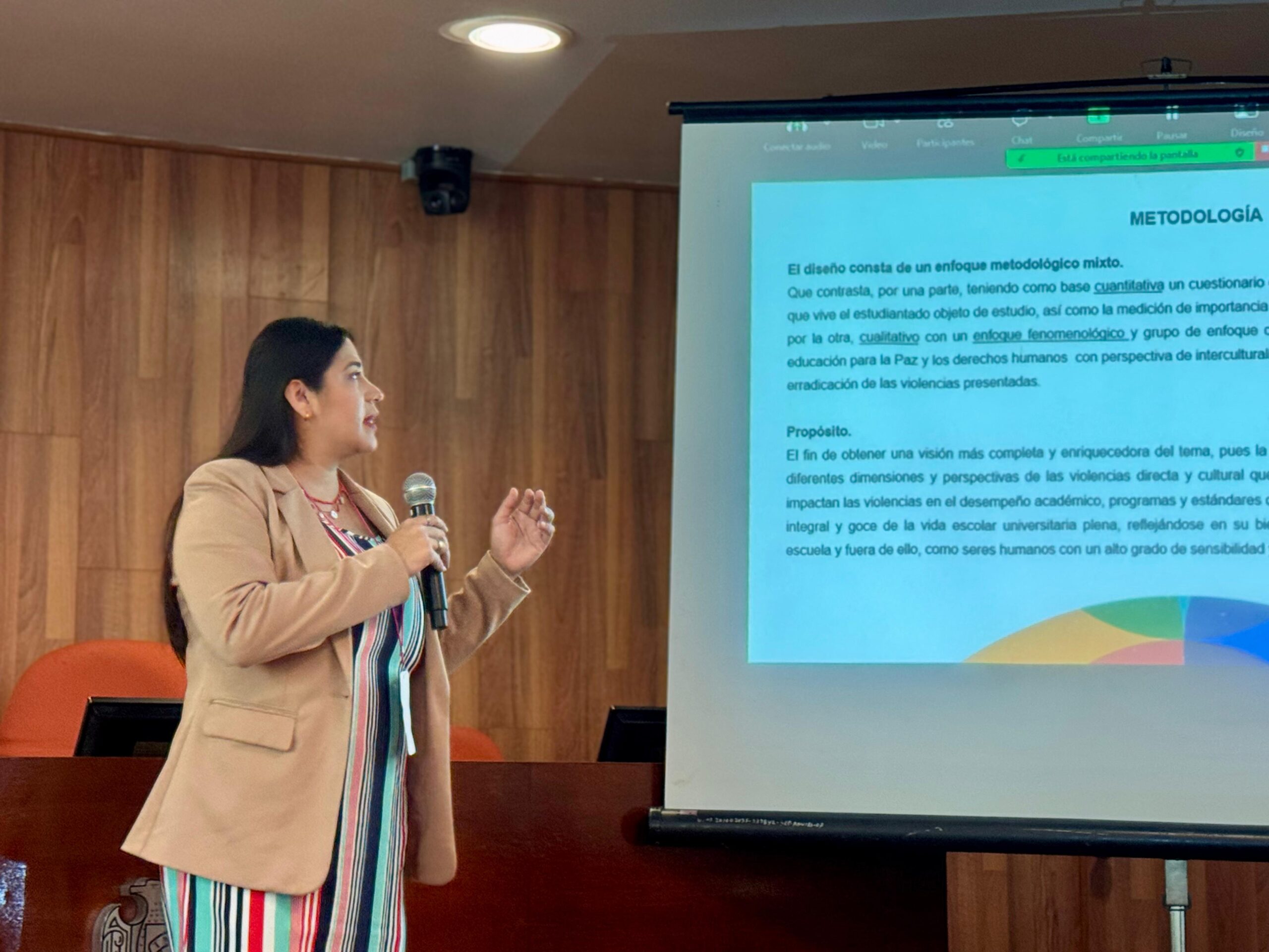 Expuso parte de los resultados del proyecto de investigación titulado Diagnóstico sobre un Proyecto Educativo para la erradicación de las violencias cultural y directa a través de la Educación para la Paz, la Igualdad de Género y los Derechos Humanos con perspectiva de interculturalidad dentro de las aulas de clase de la Universidad de Colima.