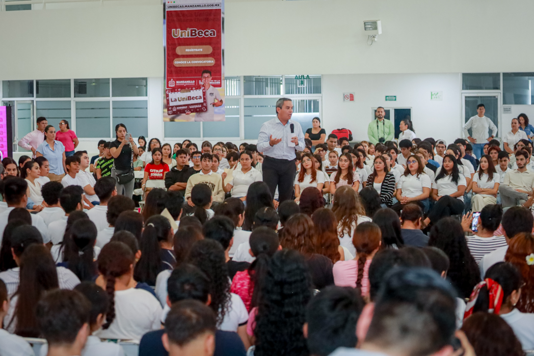 En la explanada de la Facultad de Comercio Exterior de la Universidad de Colima, campus Valle las Garzas, se presentó ayer la convocatoria del programa UniBeca, un apoyo de 9 mil pesos semestrales que otorga el Ayuntamiento de Manzanillo. Está dirigido a estudiantes originarios de este municipio que cursan sus estudios tanto en Manzanillo como en otros planteles del estado, así como a quienes cursan posgrados.