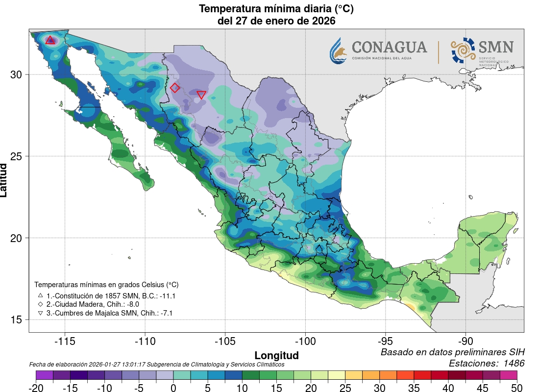 Las temperaturas más bajas -indicó Meteomex- se concentrarán principalmente en los estados de Chihuahua, Coahuila y Nuevo León, donde se prevén valores cercanos o por debajo de los 0°C, sin descartarse sensaciones térmicas de hasta -10°C.