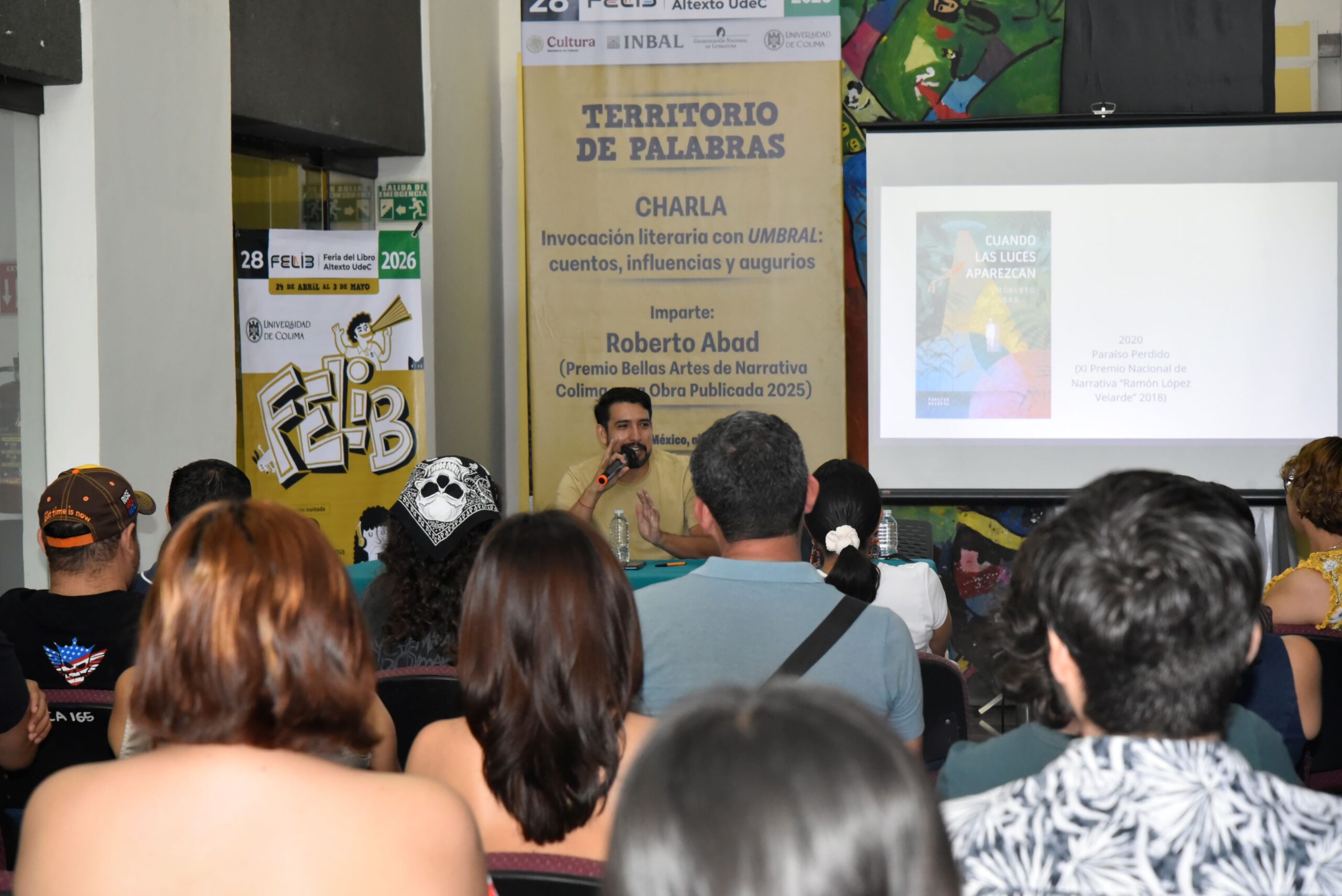 En la Feria del Libro Altexto UdeC 2026, el escritor Roberto Abad, ganador del Premio Bellas Artes de Narrativa Colima 2025, impartió la conferencia Invocación literaria con Umbral: cuentos, influencias y augurios, en la Pinacoteca Universitaria, donde abordó los procesos creativos y conceptuales detrás de su obra.