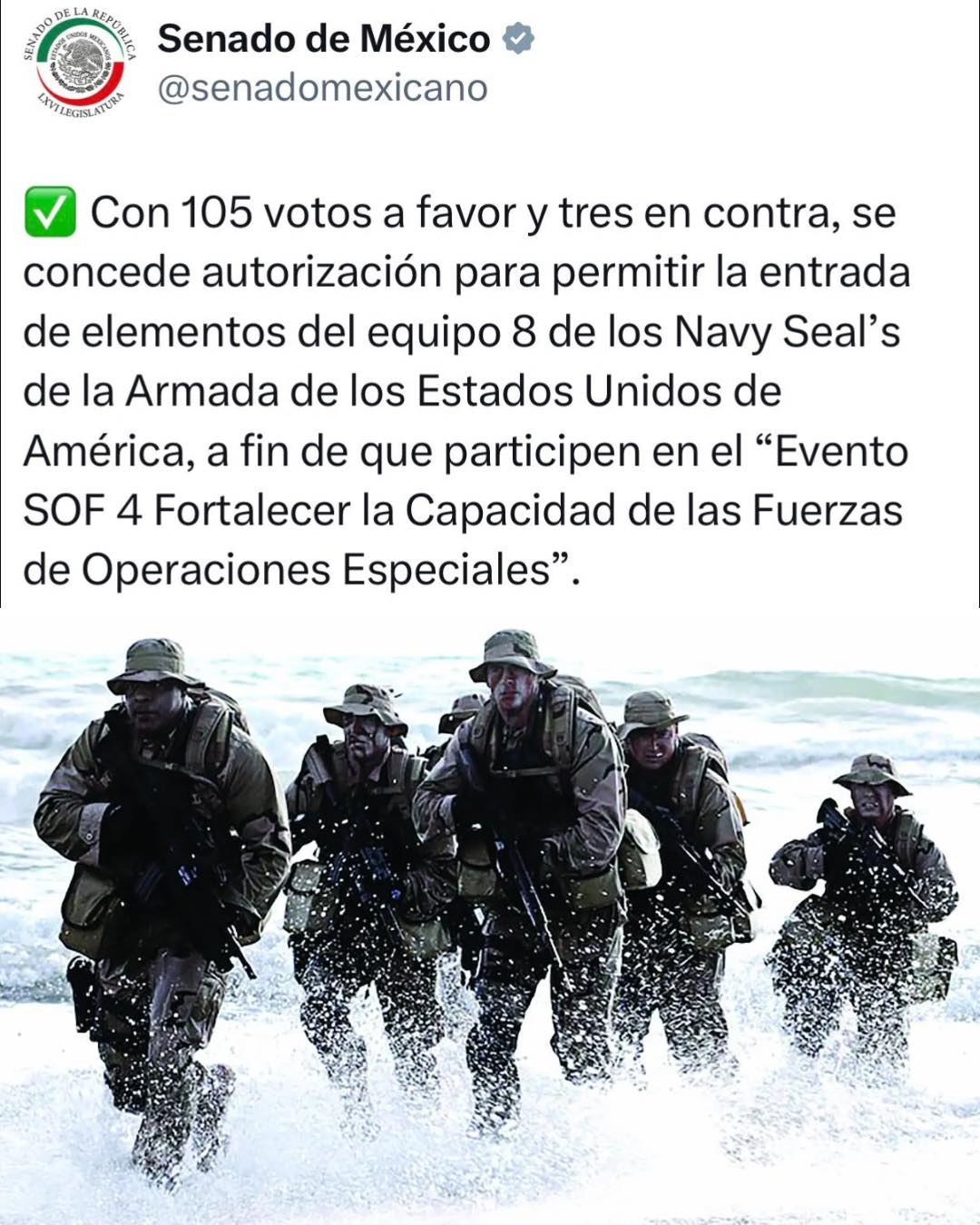El segundo dictamen autoriza a la presidenta a permitir el ingreso a territorio nacional de 23 elementos del equipo 8 de los Navy Seals de la Armada de los Estados Unidos de América, quienes participarán en el Evento SOF 4 Fortalecer la Capacidad de las Fuerzas de Operaciones Especiales, del 1 de agosto al 15 de octubre de 2026, en los estados de Campeche, México, Hidalgo y la Ciudad de México.