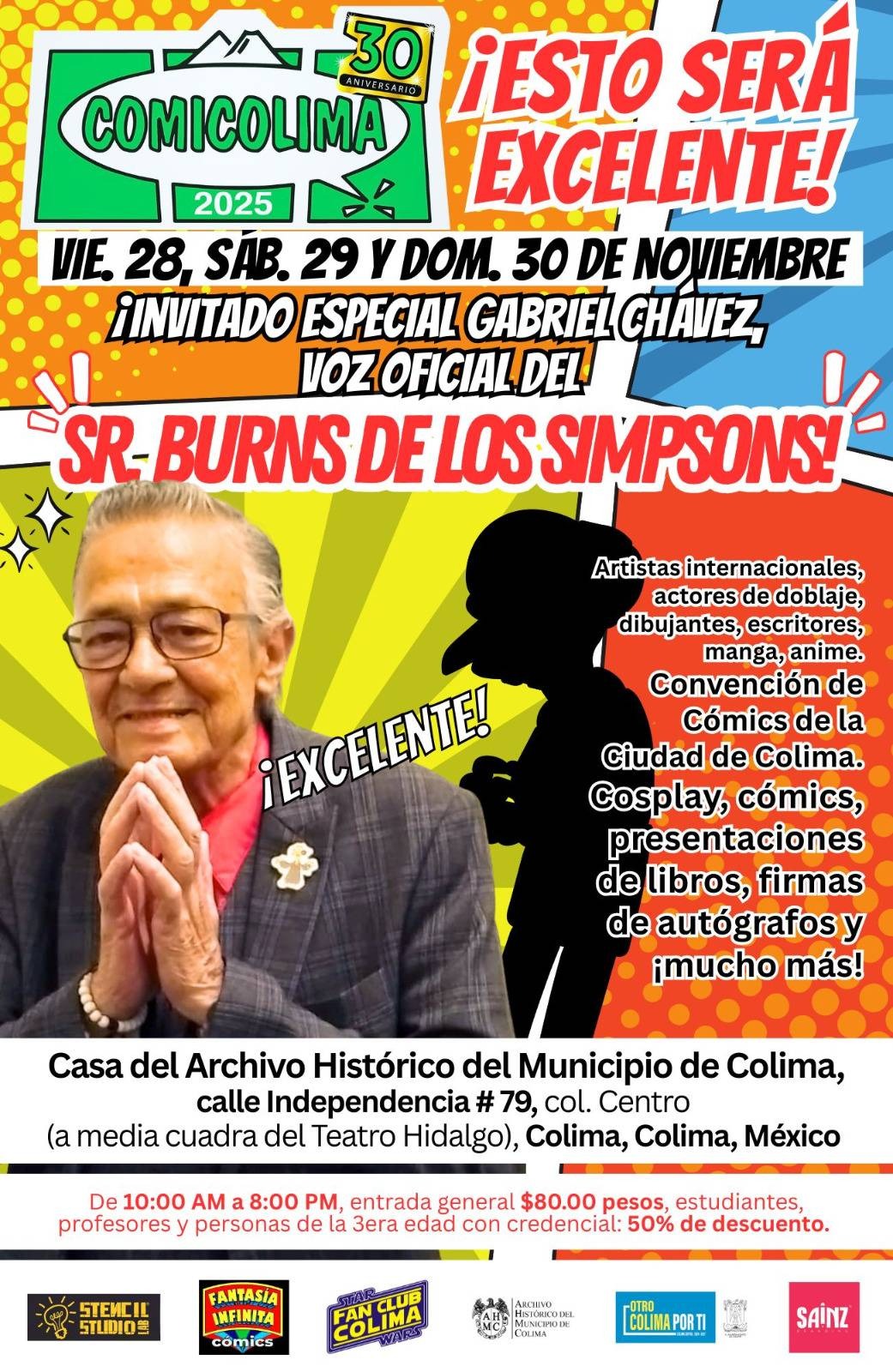Del 28 al 30 de noviembre, la Casa del Archivo del Municipio de Colima, sea sede de la Comicolima, que este año celebrará el 30° aniversario, y contará como invitado especial con el artista de doblaje Gabriel Chávez, la voz oficial del Sr. Burns, personaje de los Simpson